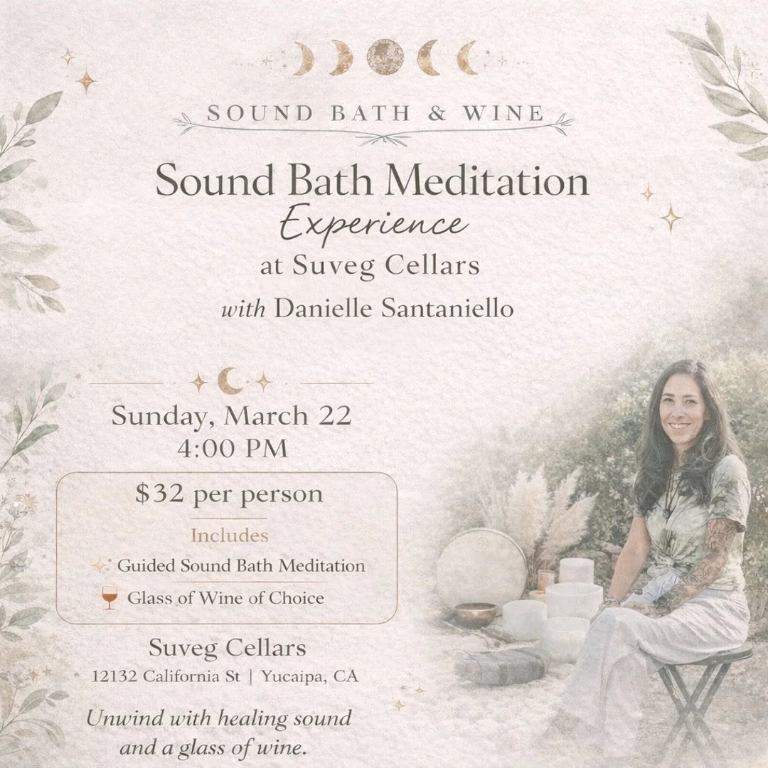 Join us for an exclusive new experience at Suveg Cellars. Guided Sound Bath experience led by Danielle Santaniello- Spiritual Sound Practitioner ; AKA Grasshoppers Healing Sounds. Guided experience with a glass of wine to mingle over to follow.
