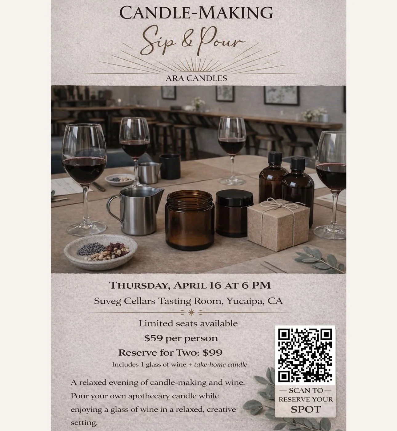 A relaxed evening of candle-making and wine. Pour your own apothecary candle while enjoying a glass of delicious Suveg wine. Ticket price includes first glass of wine.
